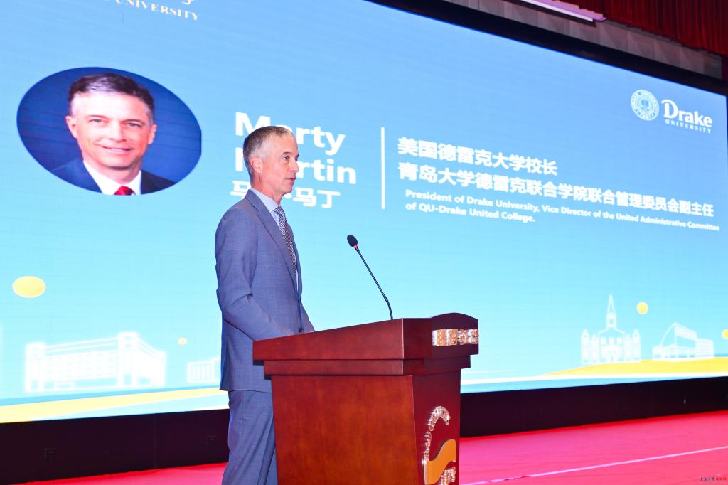 马蒂·马丁在讲话中充分肯定了联合学院自成立以来取得的积极成效,对双方团队的辛勤付出和卓越贡献表示感谢。他表示,联合学院在教学互动与学生反馈等方面均取得了良好成果,充分证明了两校合作模式的有效性与持续发展潜力。未来,德雷克大学将通过联合学院加强与青岛大学在师资交流、学生互访与课程融合等方面的协作,进一步推动双方在更多领域开展更深入的合作。