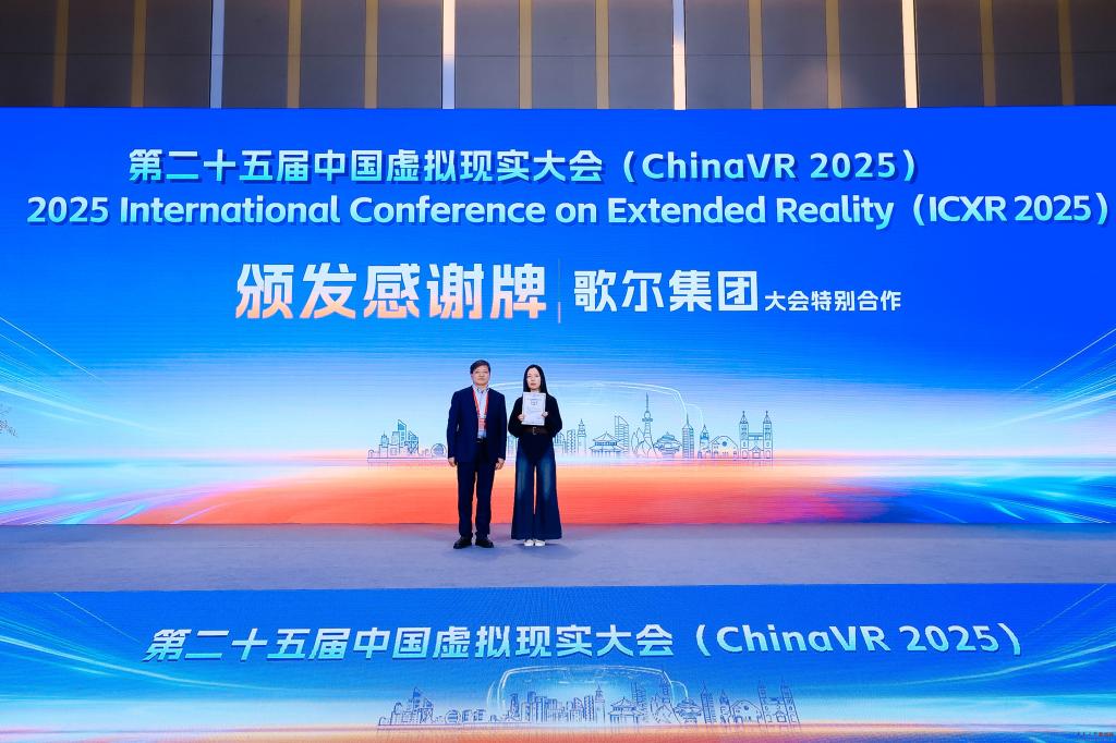 ChinaVR2025会议由中国工程院院士赵沁平、中国科学院院士胡事民、歌尔股份有限公司董事长姜滨担任名誉主席,北京航空航天大学沈旭昆教授、北京理工大学王涌天教授共同担任大会主席;青岛市委常委、副市长王波,青岛大学校长魏志强,青岛大学党委常委、副校长李建波等领导出席会议。王波副市长在致辞中对与会来宾表示热烈欢迎,并表示青岛将积极推动虚拟现实技术与海洋经济、智能家居、工业互联网、文化旅游等本地优势产业的融合创新,助力中国虚拟现实产业迈向更高水平。魏志强出席颁奖仪式,并为本次大会的特别合作伙伴歌尔集团颁发感谢牌。李建波在致辞中表示青岛大学将发挥学科优势,聚焦产业需求,以大会为平台,推动科技创新与产业创新深度融合。