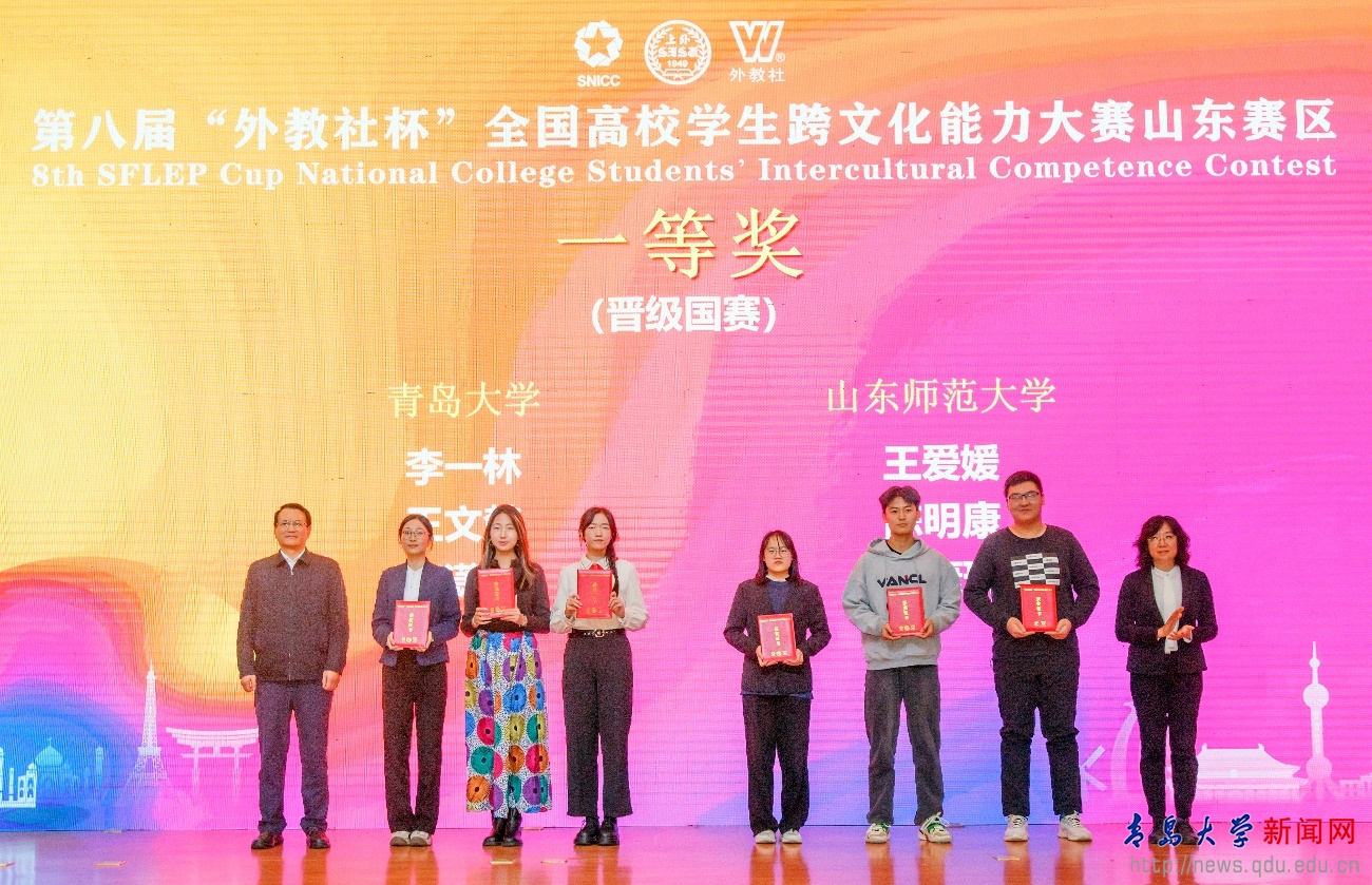 新闻网讯 10月25日至26日,第八届“外教社杯”全国高校学生跨文化能力大赛山东赛区比赛在山东师范大学举行。由我校外语学院李一林、王文楚和青岛医学院祝潇菡三名同学组成的青岛大学团队荣获一等奖,晋级国赛。公共外语教育学院秦丹雪、梁向真和外语学院张群三位老师获评优秀指导教师。